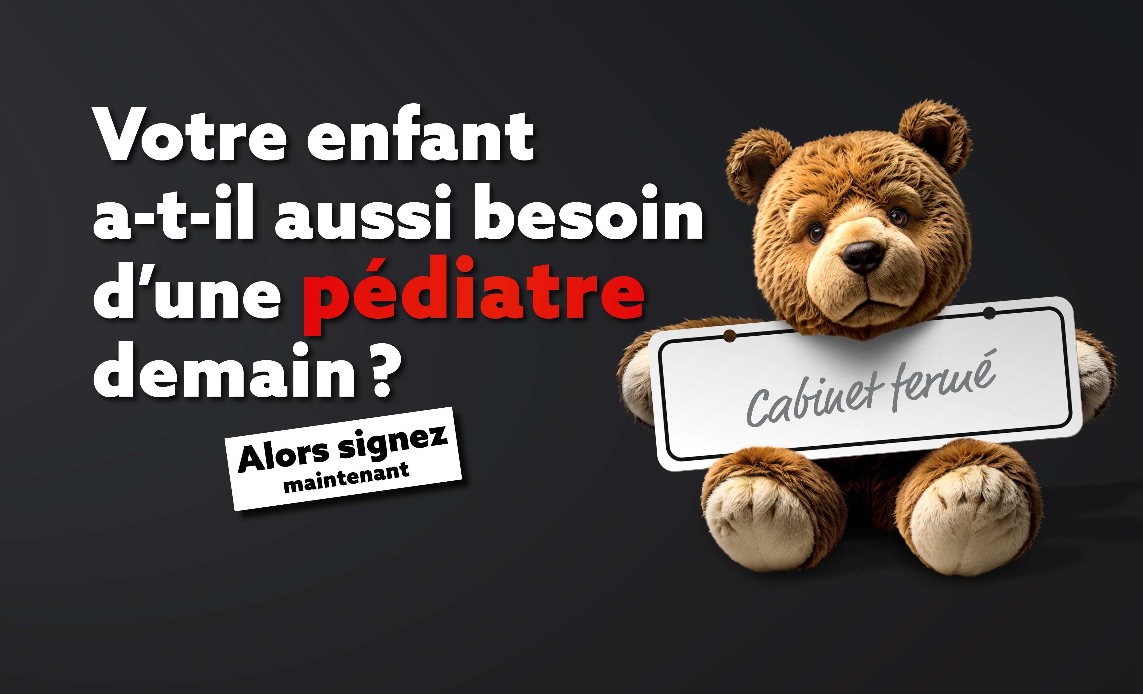 Nous utilisons des questions rhétoriques et un langage visuel fort (accrocher sa blouse au clou, ours en peluche triste à cause d’un cabinet fermé) pour nous adresser directement à ceux qui sont et seront les plus touchés par la pénurie de médecins de famille : les patients d’aujourd’hui et de demain ainsi que leurs proches :